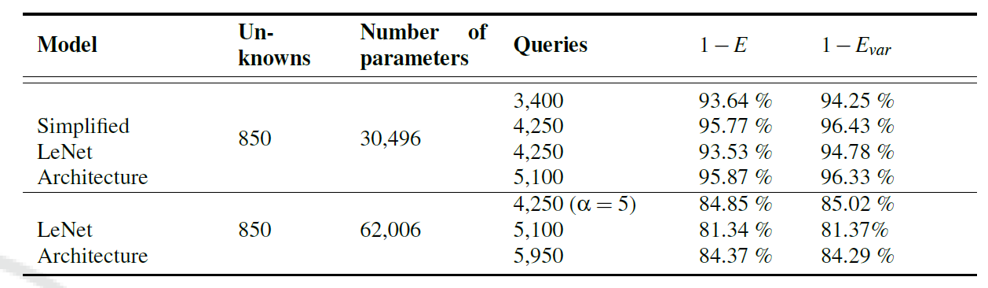 When performing the attack on the last layer of the LeNet model, attacks were conducted on both the original LeNet model and a simplified LeNet model with the number of filters in the first convolution layer reduced from 16 to 6. The similarity to the original model was measured as $ 1-E, 1- E_{\mathrm{var}}$.