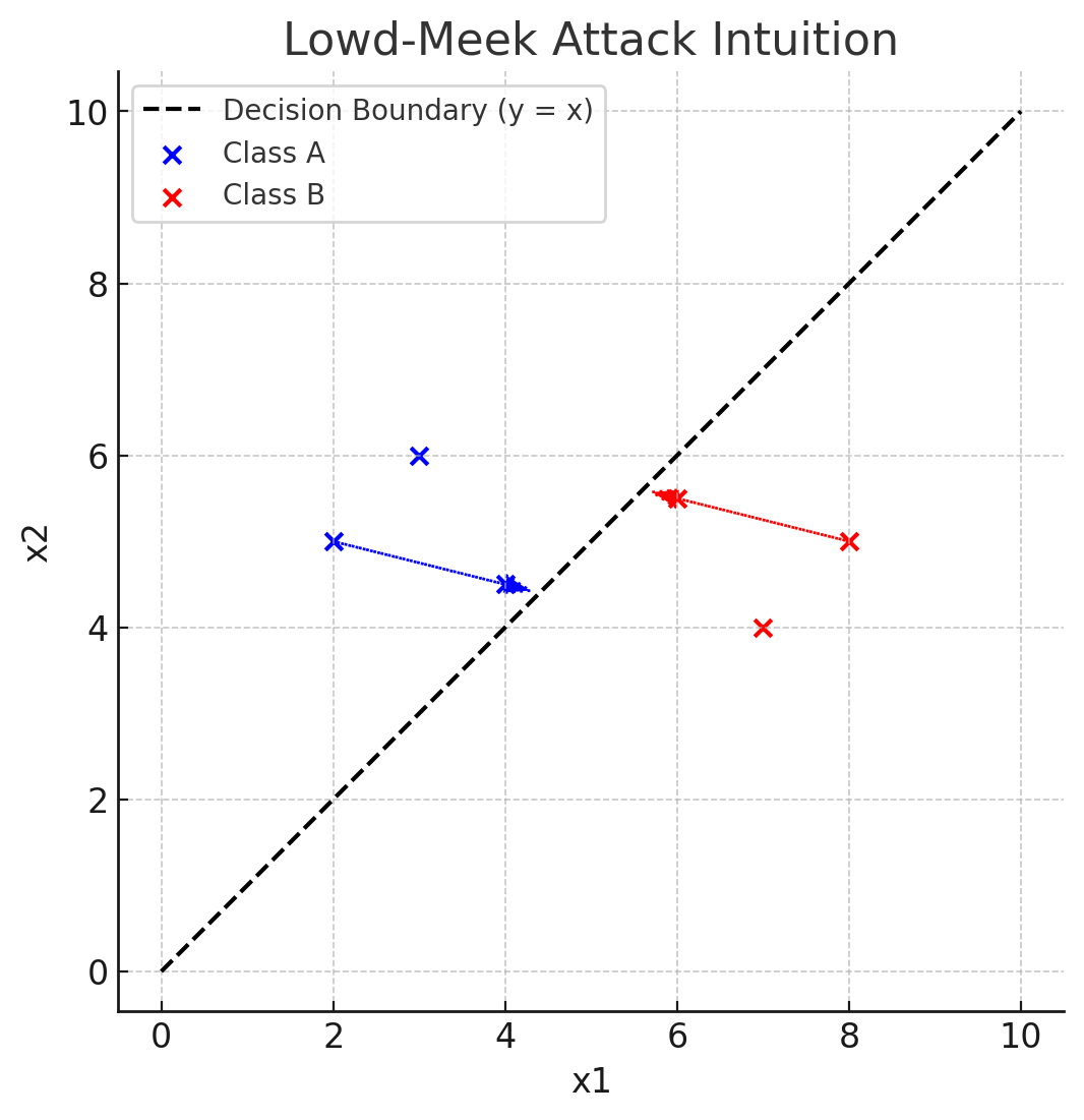 The model separates two classes based on a decision boundary. For any pair of arbitrary points (x1, x2) with different output classes, the attacker narrows down the boundary point through binary search to estimate the decision boundary. The collected data is then used to reconstruct the model’s parameters.