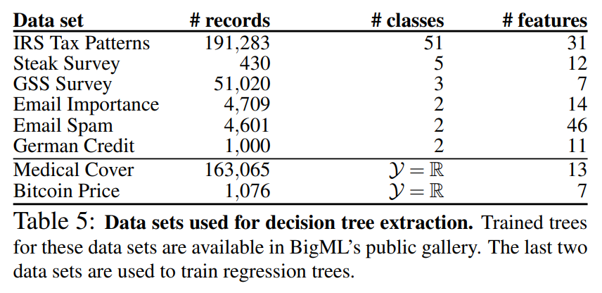 Below is the training data for the decision trees used in the experiments. This data is available from BigML, with the number of rows, classes, and features for each dataset specified:
