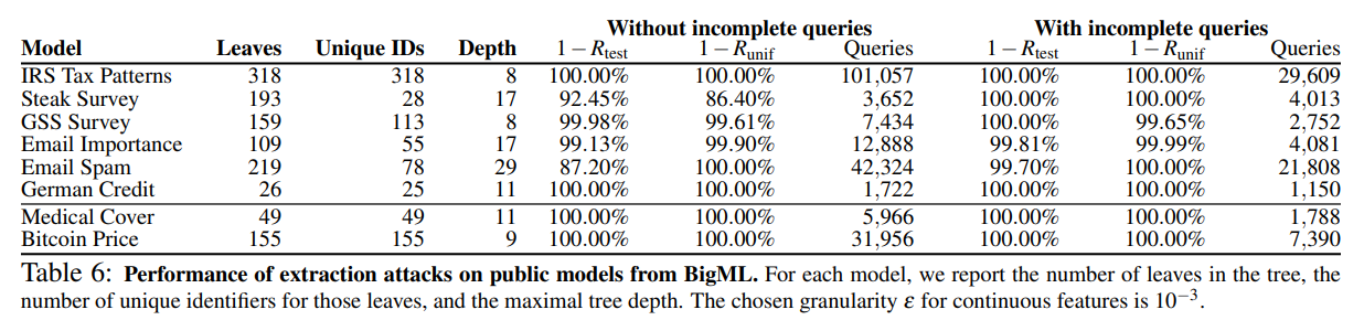 The table below shows the results of the decision tree model extraction attack from the paper: