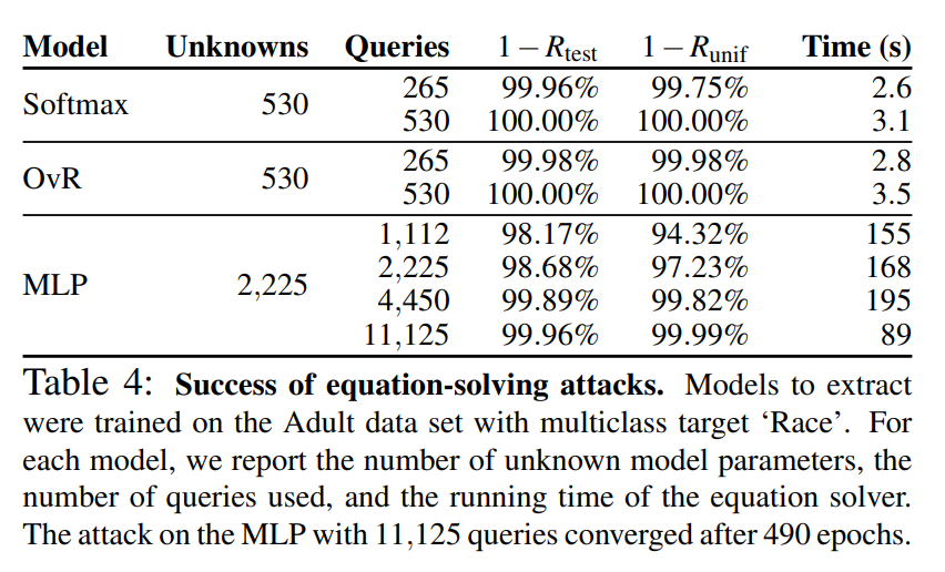 The Equation Solving Attack on MLP models can be conducted in the same manner as for MLR, but requires more queries. Furthermore, it cannot be guaranteed that the extracted model will behave identically.