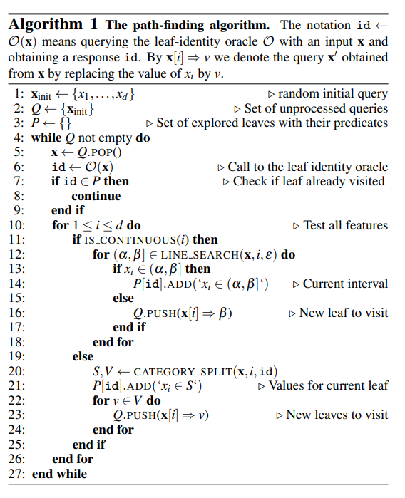 The above algorithm reconstructs the tree by exploring the branching conditions for each feature of the input.