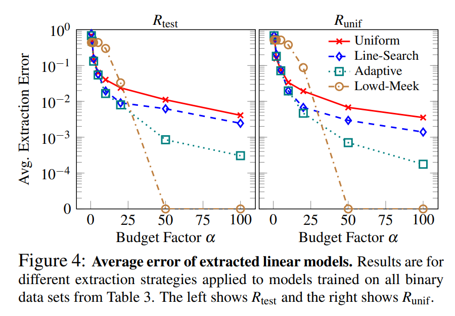 \[\begin{align} R_{\text{test}}(f, \hat{f}) = \frac{1}{|D|} \sum_{(x, y) \in D} d(f(x), \hat{f}(x)), \quad \text{where } D \text{ is the test set}.\\ R_{\text{unif}}(f, \hat{f}) = \frac{1}{|U|} \sum_{x \in U} d(f(x), \hat{f}(x)), \quad \text{where } U \text{ is a set of uniformly sampled inputs from } \mathcal{X}. \end{align}\]Each metric evaluates the agreement on test data and the accuracy over the entire input space between the target model and the extracted model.