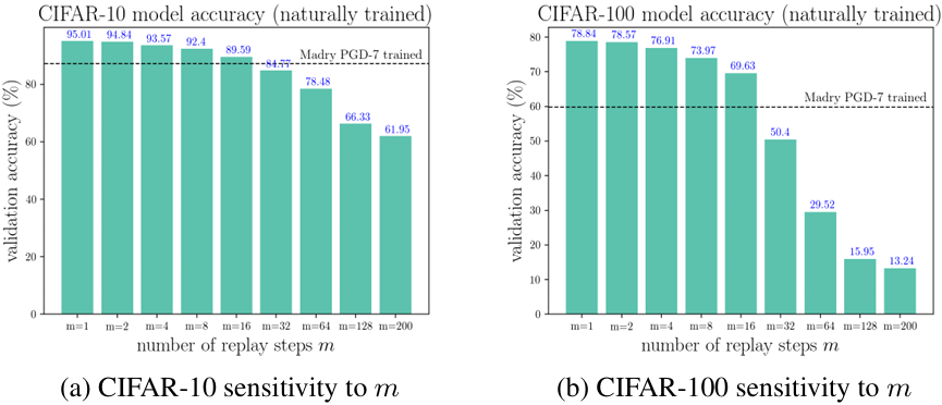 The figure above shows a controlled experiment where, instead of running Free training, only pure natural training is run while varying \(m\). \(m=1\) is identical to standard training, and as \(m\) becomes very large the validation accuracy drops sharply. But for small \(m\) (roughly the $m \le 10$ regime), the drop in accuracy is surprisingly small. For reference, the natural accuracy attained by a 7-PGD adversarially trained model (87.25% on CIFAR-10, 59.87% on CIFAR-100) is already matched by pure natural training with \(m=16\) or so. In other words, the generalization loss incurred by a small \(m\) is a perfectly acceptable cost compared to the robustness gained by adversarial training.