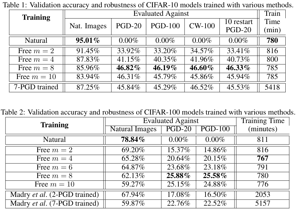 This paper breaks through that bottleneck in a rather elegant way. The authors’ key observation is simple: in a single backward pass already performed during standard training, we can simultaneously obtain both the gradient used to update the parameters and the gradient used to update the adversarial perturbation. Adding one small device on top of this observation — a minibatch replay — they propose a “Free” adversarial training that achieves robustness rivaling PGD training at essentially the same cost as standard training.