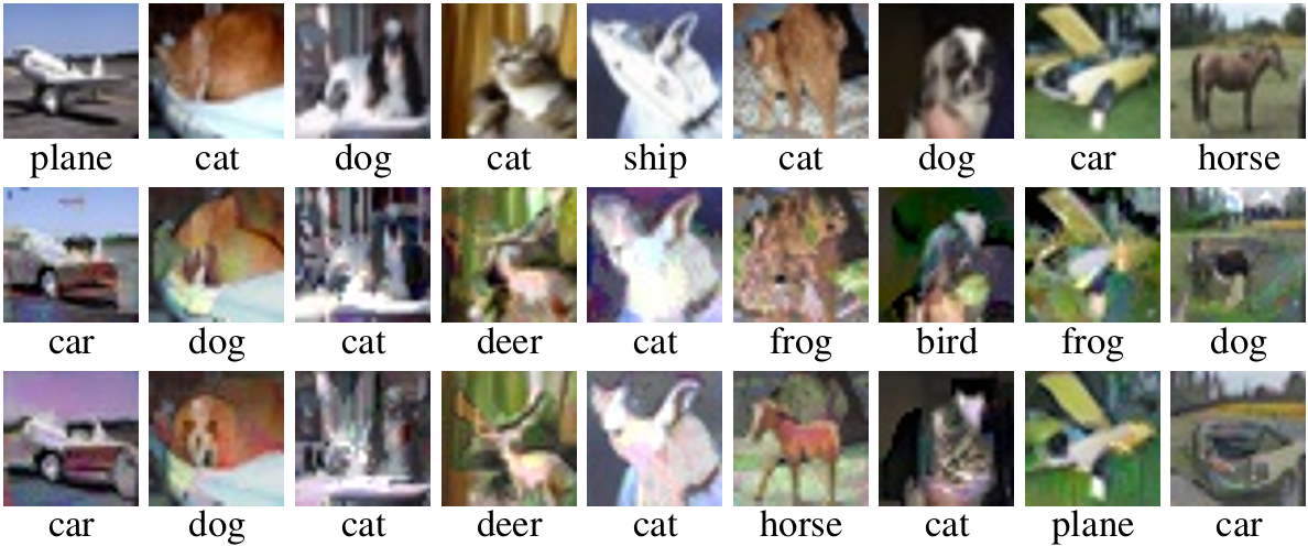 The figure above shows adversarial examples produced by a BIM attack with a fairly large allowed perturbation of \(\epsilon = 30\). The top row is the original images, the middle row is the attack images crafted against the 7-PGD-trained model, and the bottom row is the attack images crafted against the Free \(m=8\)-trained model.