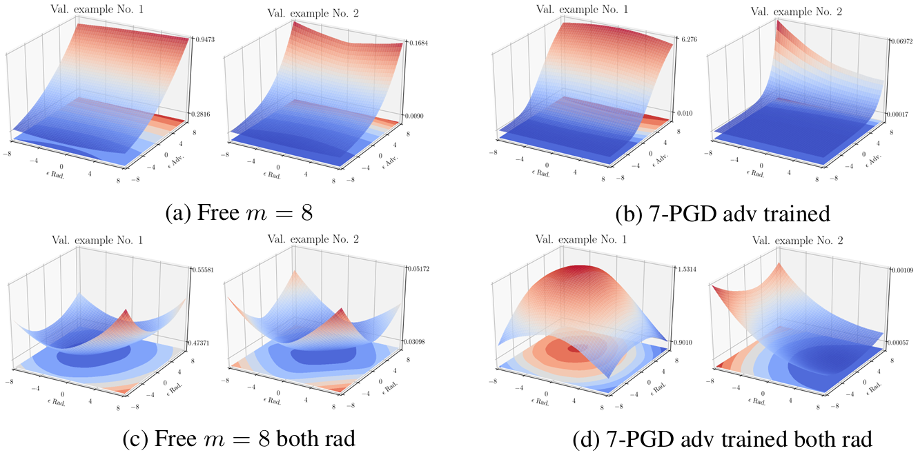 If the model were operating via gradient masking, one would expect a strange shape in which the loss is flat along the adversarial direction but changes a lot along random directions. In both the Free-trained model \((a)\) and the 7-PGD-trained model \((b)\), however, the adversarial direction does in fact correspond to the direction of greatest change in loss, and the landscape itself is smooth and flat for both models. The interpretation is that Free training’s robustness is not the result of hiding gradients to dodge attacks, but is genuinely the result of broadly flattening the loss landscape.