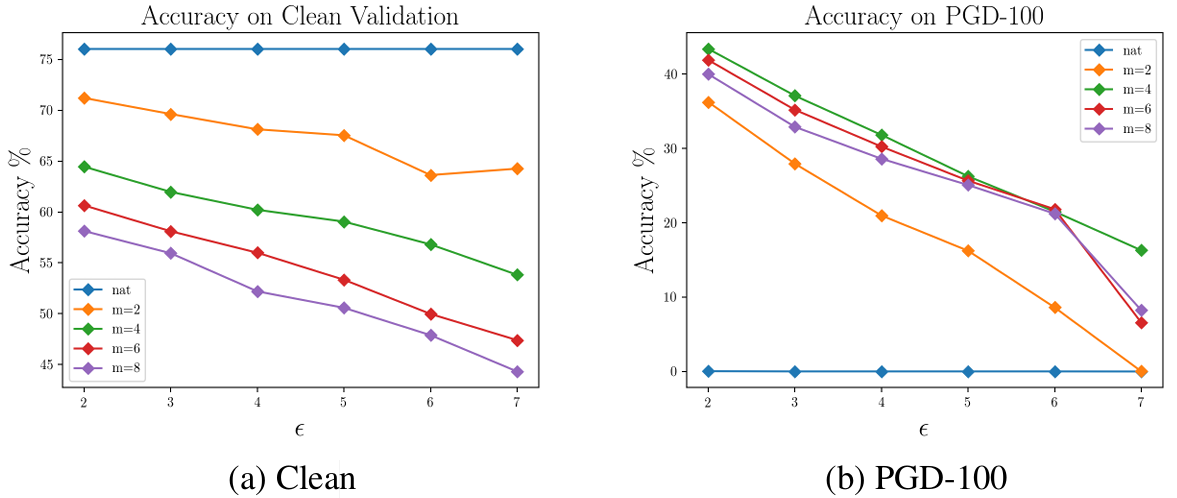 The figure above shows natural accuracy and robust accuracy under PGD-100 attack measured while jointly varying the training-time perturbation budget \(\epsilon\) and the minibatch replay count \(m\). With \(\epsilon = 2\), the Free \(m=4\) model maintains 43.4% robust accuracy under PGD-100 — at the time of publication, the first level of robustness on ImageNet ever achieved against non-targeted attacks.