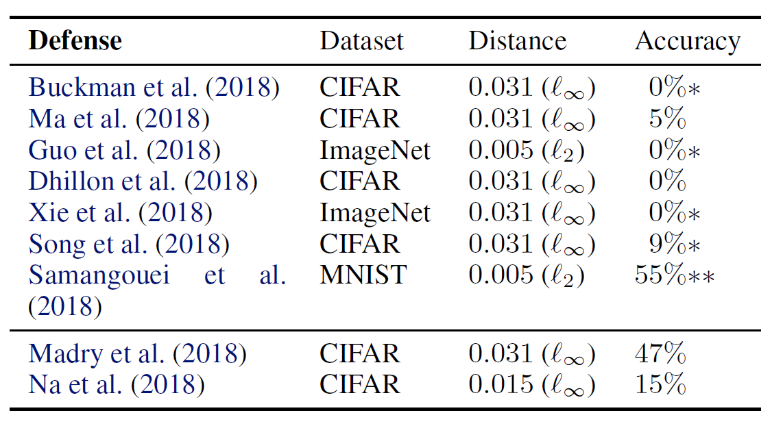 앞서 제안한 방법들로, 저자들은 ICLR 2018에 게재된 9개의 최신 방어 기법들에 대한 우회를 시도하였습니다. 그 결과는 다음 표와 같습니다.