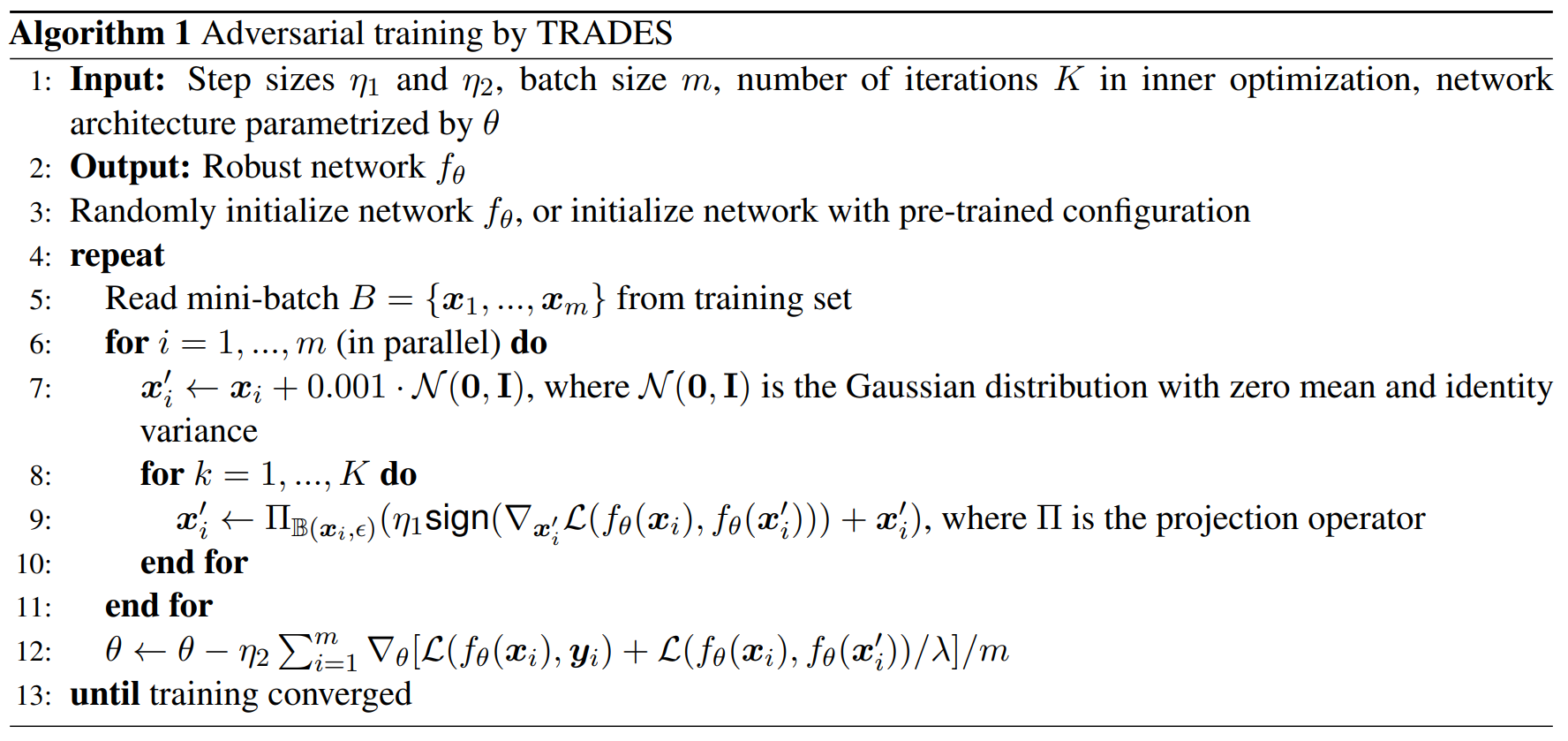 line 9: 고정된 파라미터 \(\theta\)에서 \(x'_i\)를 projected gradient ascent로 \(K\)번 갱신하여, \(\max_{x'_i \in B(x_i,\epsilon)} \mathcal{L}(f_\theta(x_i), f_\theta(x'_i))\)를 근사적으로 풉니다. 중요한 점은 여기서 증가시키고자 하는 loss가 일반 adversarial training의 \(\mathcal{L}(f_\theta(x'_i), y_i)\)가 아니라, 원본 입력과 perturbed 입력의 예측 차이를 측정하는 \(\mathcal{L}(f_\theta(x_i), f_\theta(x'_i))\)라는 점입니다. 매 step마다 \(x'_i\)를 그 증가 방향으로 이동시킨 뒤, projection으로 항상 \(B(x_i,\epsilon)\) 안에 머물게 합니다.