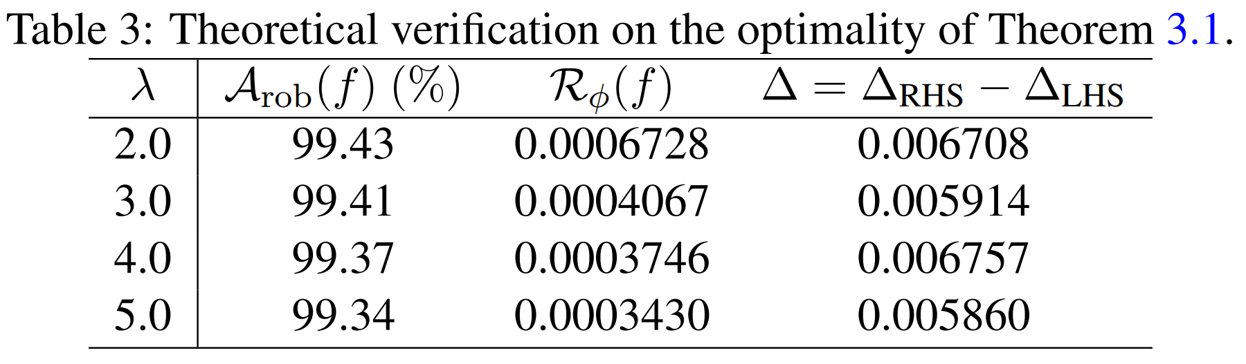 그 결과, 위 표에서 \(\Delta = \Delta_{RHS} - \Delta_{LHS}\)가 약 0.0059~0.0068 수준으로 매우 작게 나타납니다. 즉, 이론에서 유도한 upper bound가 실제 robust error를 지나치게 느슨하게 감싸는 것이 아니라, 실험적으로도 꽤 정확하게 추적하고 있음을 확인할 수 있습니다.