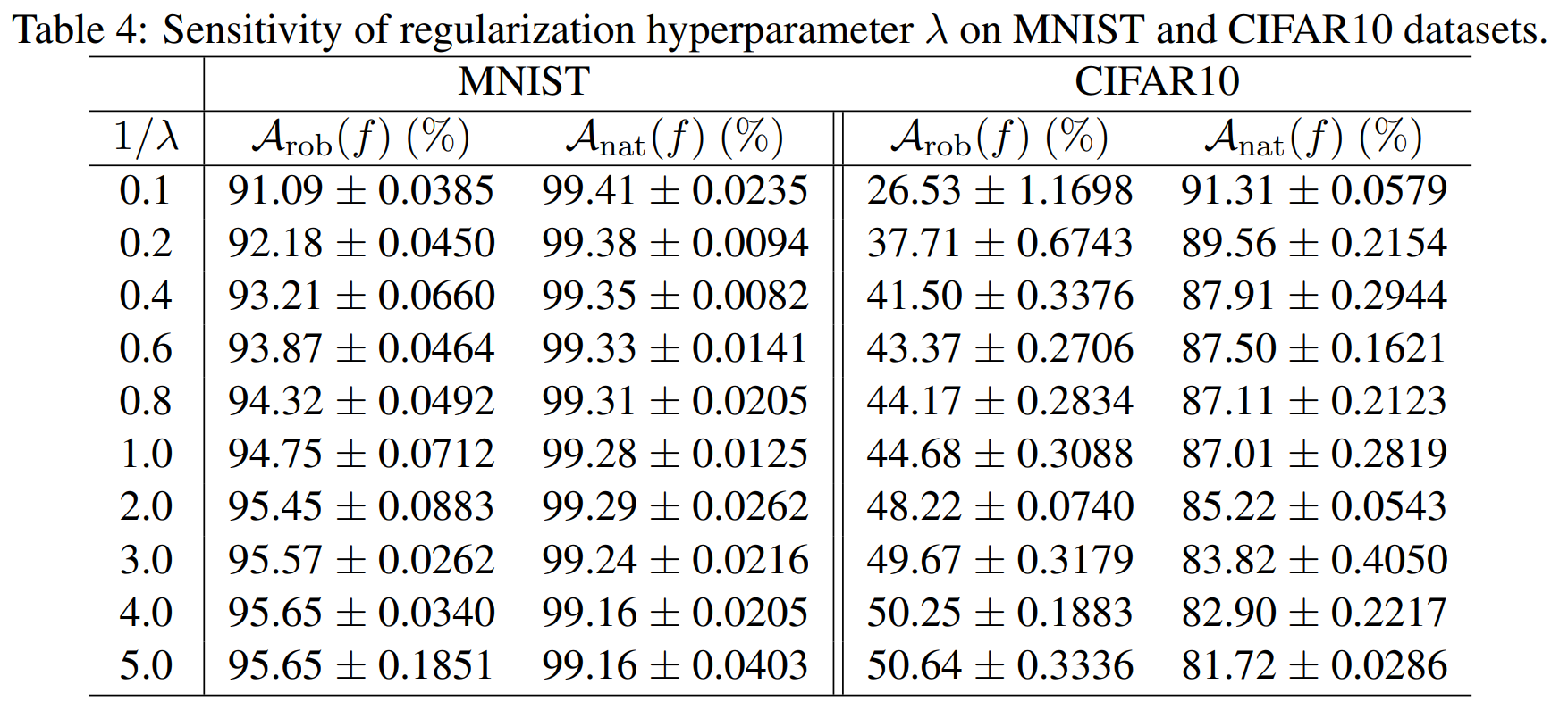다음 실험에서는 multi-class 분류로 넘어가 cross-entropy 기반 TRADES를 MNIST와 CIFAR10에 적용합니다. MNIST에서는 소형 CNN, CIFAR10에서는 ResNet-18을 사용하였고, 두 데이터셋 모두에서 \(\frac{1}{\lambda}\)를 변화시키며 natural accuracy \(A_{nat}\)와 robust accuracy \(A_{rob}\)의 변화를 관찰합니다.