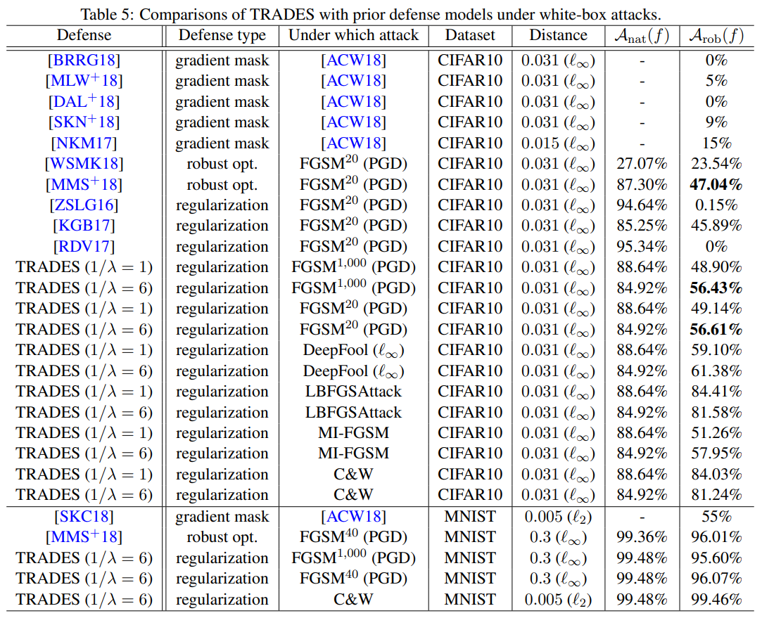 이 설정에서 TRADES는 기존 방어 기법과 비교해 더 높은 robust accuracy를 보입니다. 예를 들어 CIFAR10의 PGD 20-step 공격에서는 Madry 모델의 47.04%보다 높은 56.61%를 기록했으며, DeepFool, MI-FGSM, C\&W 등 다른 white-box 공격에서도 일관되게 높은 성능을 보입니다.