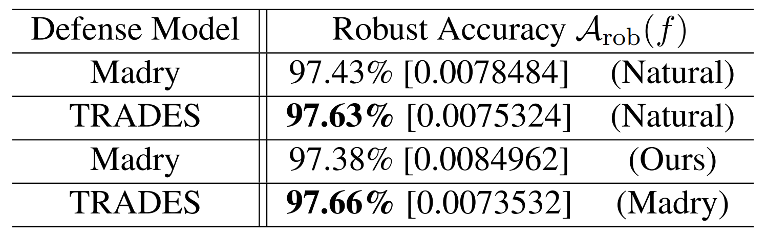 MNIST를 분류하는 task는 CIFAR10보다 더 쉽기 때문에 natural accuracy 감소폭은 상대적으로 작습니다. 저자들은 이를 통해 robustness와 accuracy 사이의 trade-off가 이론뿐 아니라 실제 데이터셋에서도 관찰된다고 주장합니다.